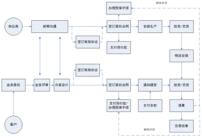 本公司的供应链贸易服务,主要为生产商提供采购执行和分销执行的综合服务,按照客户的采购或销售需求,提供市场信息、价格协调、排产协调、交货协调、物流策划、通关、仓储、配送、简单加工、资金、结算等“一条龙”服务,最终将商品销售给客户或客户指定的购买商。